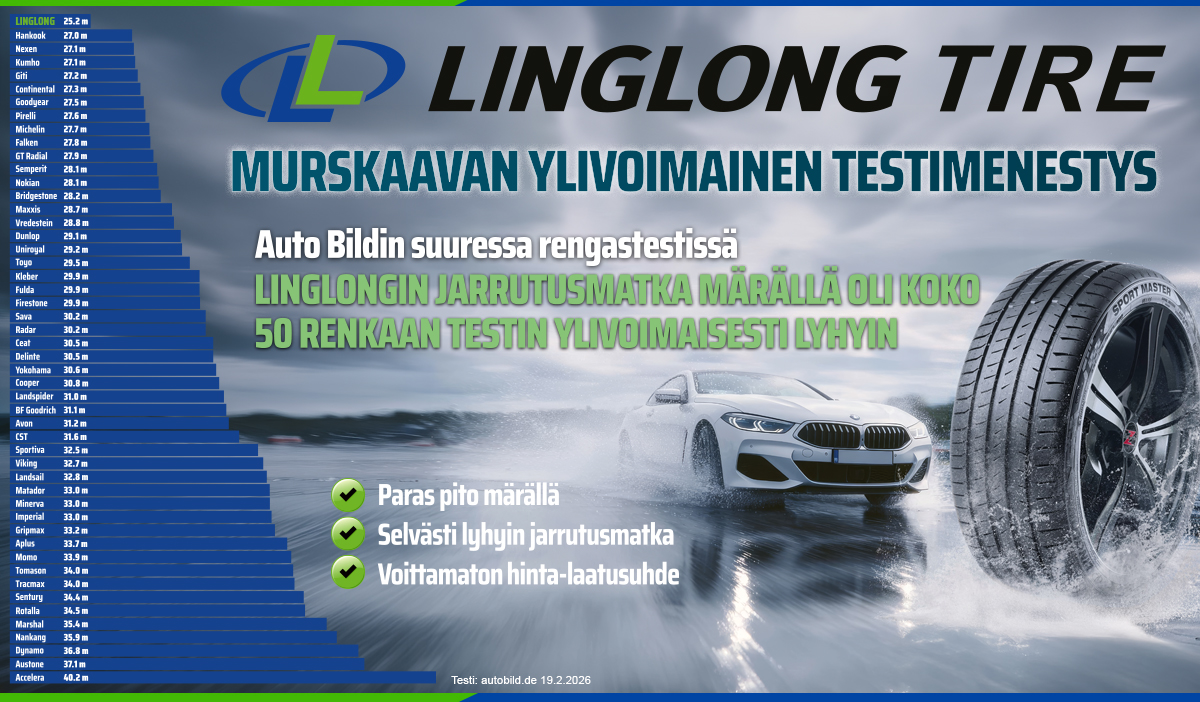 Linglong Sport Master -kesärengas nousi kirkkaasti kärkeen saksalaisen Auto Bildin suuressa kesärengastestissä (03/2026), jossa testattiin huikeat 50 eri kesärengasta. Rengas saavutti testin lyhyimmän jarrutusmatkan märällä asfaltilla, pysähtyen vain 25,2 metrissä 80 km/h nopeudesta. Ennennäkemättömän ylivoimainen Linglong voitti toiseksi tulleen suuremmalla erolla kuin kakkonen viidenneksitoista parhaan renkaan.
